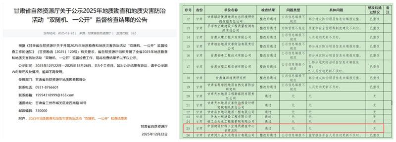 近日,甘肃省自然资源厅网站发布《关于公示2025年地质勘查和地质灾害防治活动“双随机、一公开”监督检查结果的公告》,公告显示,甘肃总队顺利通过本次监督检查,各项工作得到检查组充分认可。
