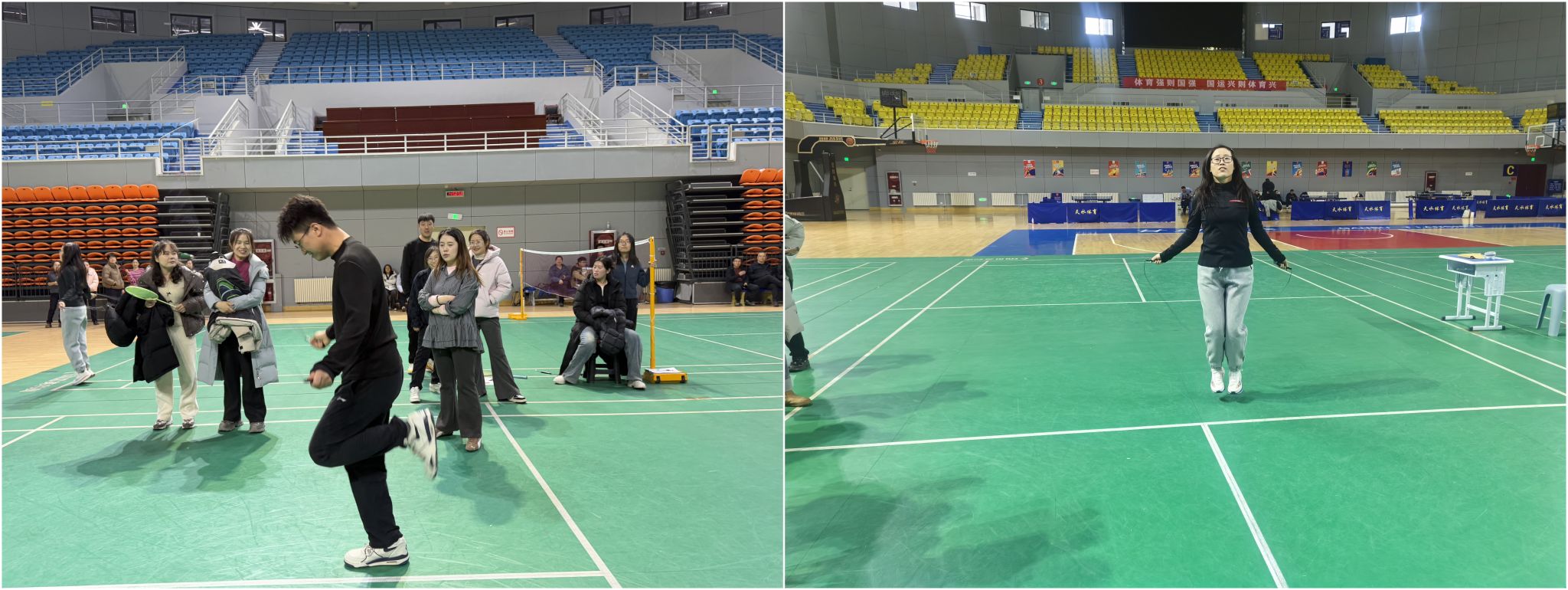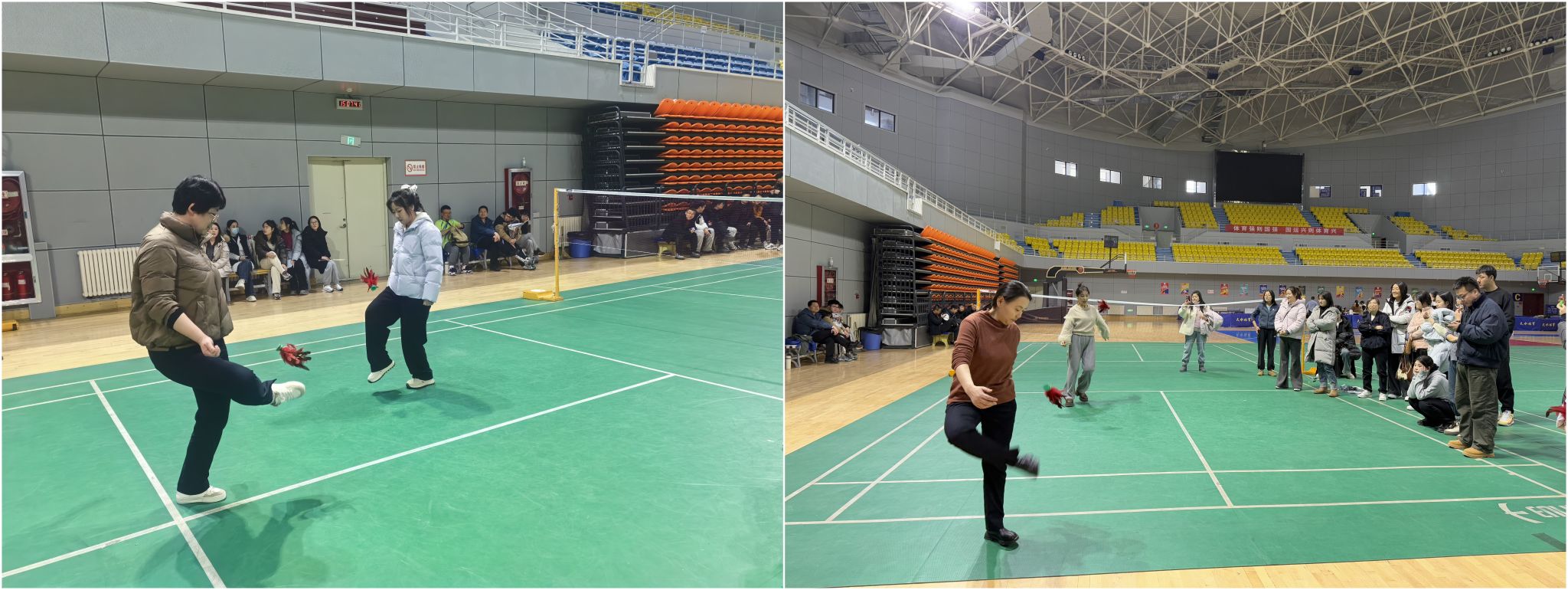 本届运动会共设置了篮球、羽毛球、兵乓球、跳绳、踢毽子、五子棋6个项目。赛场上,运动健儿们坚持不懈,赢得了现场观众的阵阵助威声!裁判员和工作人员各司其职,以“公平公正”的原则保证了各项比赛的正常进行。