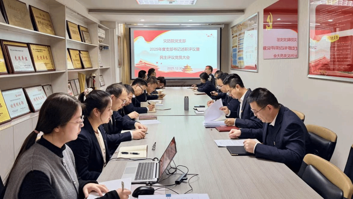 12月30日,灾防院党支部在中材大厦四楼会议室召开2025年度党支部书记述职评议暨民主评议党员大会。副总队长崔军强到会指导,会议由灾防院党支部书记、副院长王凯主持,灾防院党支部18名党员参加会议。