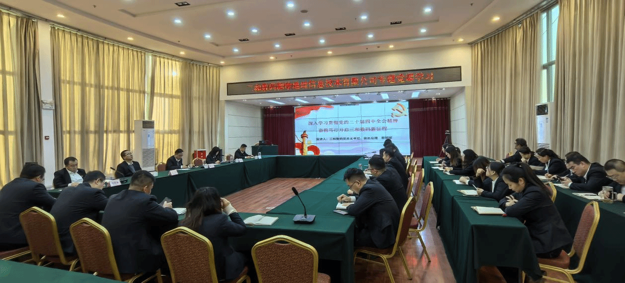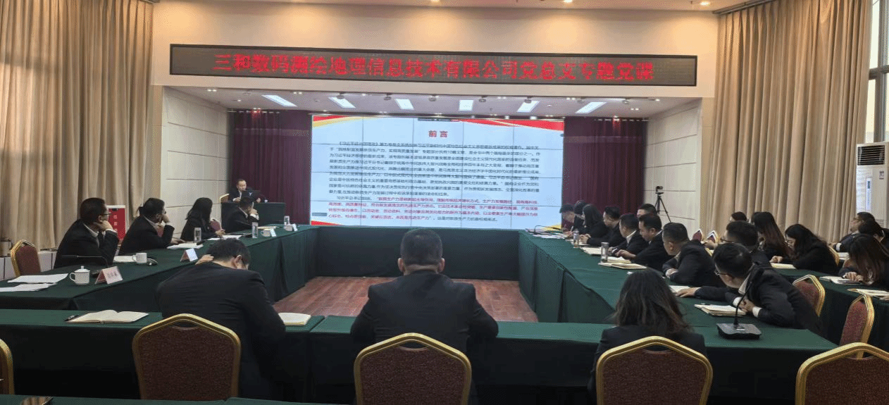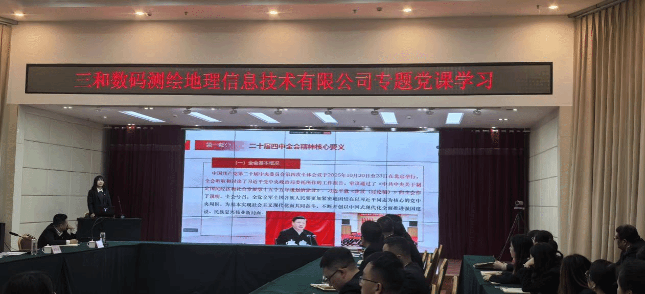 会上,三和数码党总支书记、副总经理靳娟丽以《深入学习贯彻党的二十届四中全会精神 奋楫笃行开启三和数码新征程》为主题,从全会基本概况、核心要义,“十五五” 时期指导思想、指导原则、历史任务、重要地位及发展主要目标等维度展开解读。同时,结合三和数码实际,她指出,三和数码要加快高水平科技自立自强,持续强化技术优势,提升核心竞争力。在科技创新与产业创新融合发展方面,进一步拓展低空经济、实景三维中国建设、美丽中国建设、数字孪生城市建设等新兴业务领域,加强与上下游企业的合作与协同,构建产业生态链,共同推动产业发展和升级;在统一大市场方面,坚决贯彻总队提出的“一盘棋”思想,激发经营人员“一条心”理念,加强与各兄弟单位经营团队联系和沟通,努力拓展经营业务范围,稳固市场业务占有率。充分发挥“四心两站一联盟”优势,吸引测绘地理信息专业人才、研发人才、管理人才加入三和数码,加强与高校、科研院所的合作;在社会责任方面,发挥技术优势助力美丽中国建设与乡村振兴,为地方经济社会发展注入更多“数字动能”。