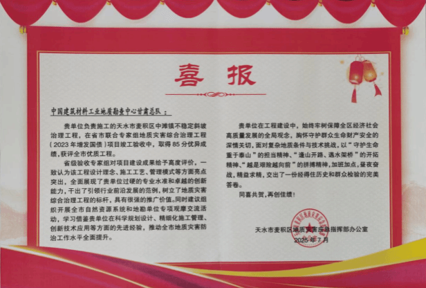 2025年,灾防院荣获天水市“地质灾害治理工程优秀单位”称号,麦积区中滩镇不稳定斜坡治理工程获评“全市优质工程”。麦积区道北办吕家村滑坡治理工程、中滩镇及社棠镇俊林村治理工程作为年度三大标杆项目,分别以卓越的监理服务、专业的技术实施与创新的勘查设计,全面展现灾防院在全产业链上的综合实力。