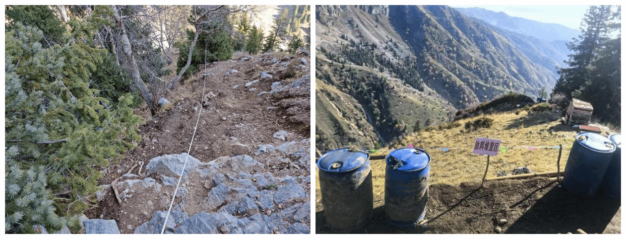 钻孔施工位于天山林区,无法修路,且钻孔设计深度超过300米,需800型以上大型钻探设备方能完成。设备及数吨物资必须运抵坡度近70度的山顶,常规运输方式无法实现。