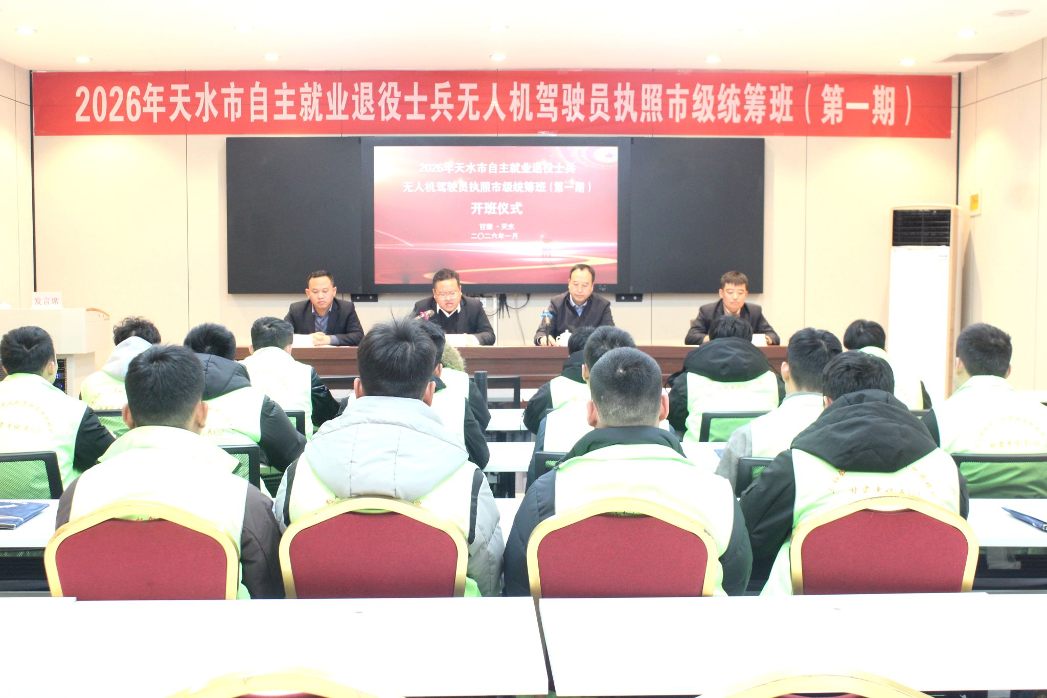 1月13日,2026年天水市自主就业退役士兵无人机驾驶员执照市级统筹班(第一期)开班仪式在三和数码低空经济产业分公司隆重举行。天水市退役军人事务局党组成员、副局长姚永彦,三和数码低空经济产业分公司相关负责同志,以及全体参训退役士兵齐聚一堂,共同开启技能提升、逐梦转型的新征程。